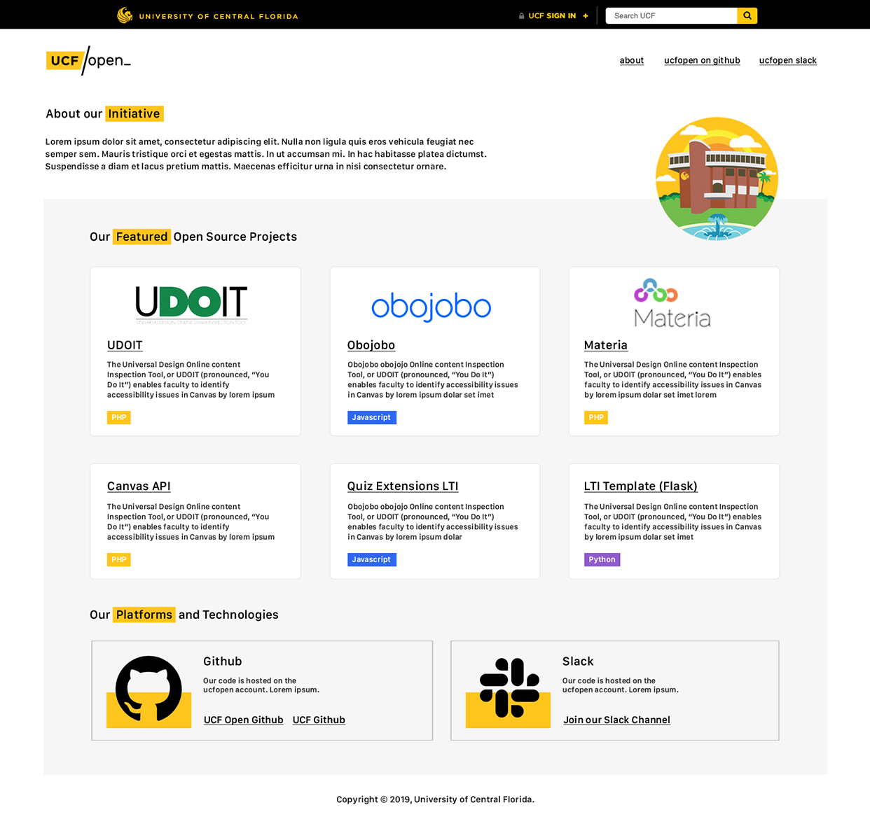 Splash page for the UCF Open initiative at UCF. I designed this as an alternative to the Github splash page that we were linking to originally. This was a collaboration between multiple members of our team, but I kickstarted the design so we could get something done. Eventually we plan to create a more fleshed out page/site, but we wanted to have something up that would inspire connection and collaboration.